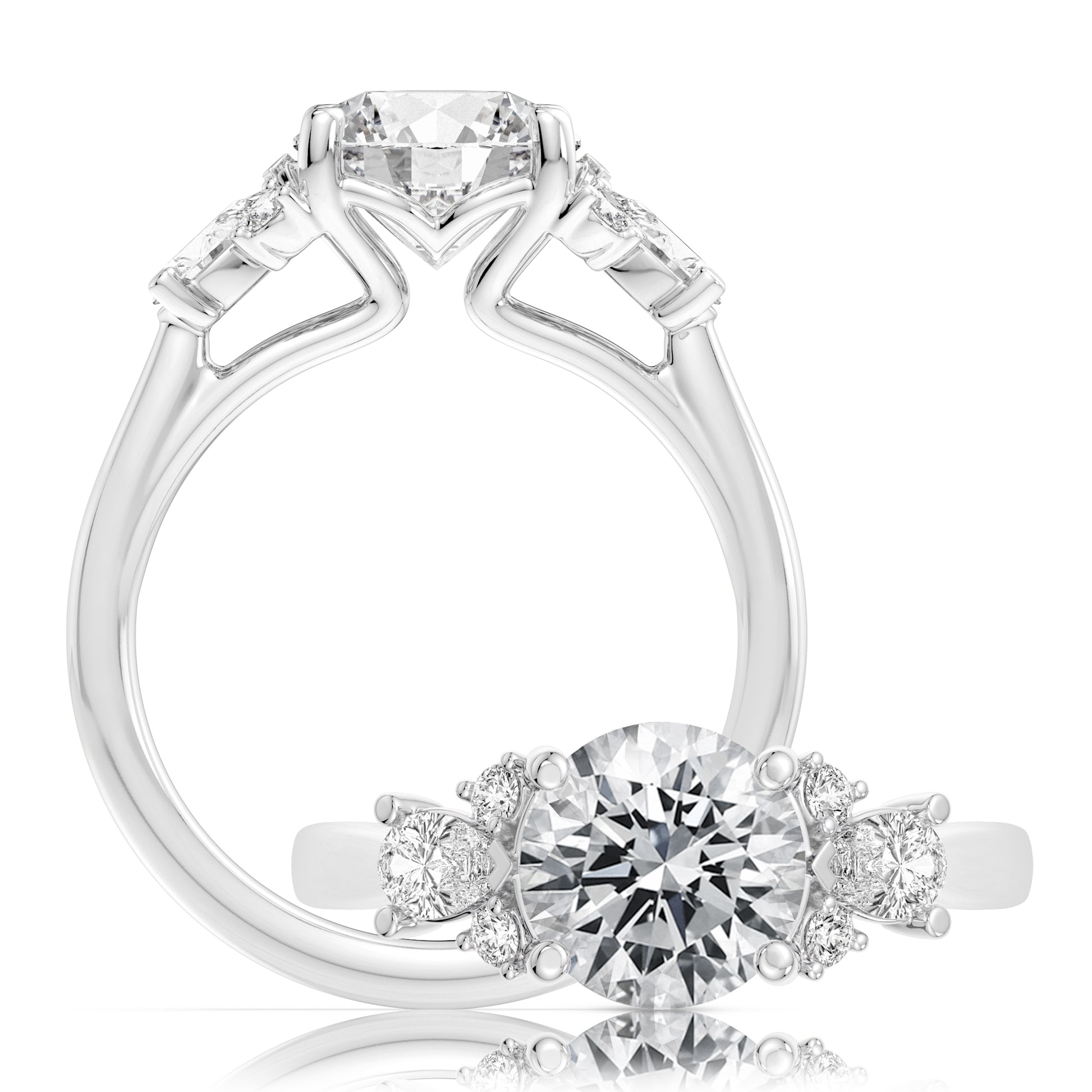 Peter adds a modern flair to this cluster three stone ring. A kite diamond with two round diamonds on either side. Available for all center stone shapes and sizes.