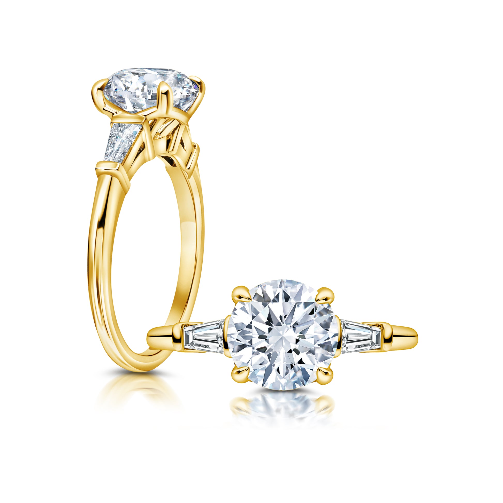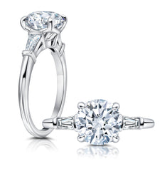 Peter adds a modern flair to this trapezoid three stone ring. The high polish shank helps to add focus to your chosen center.