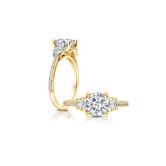 Peter adds a modern flair to this trapezoid three stone ring. Small diamonds help to highlight your chosen center.