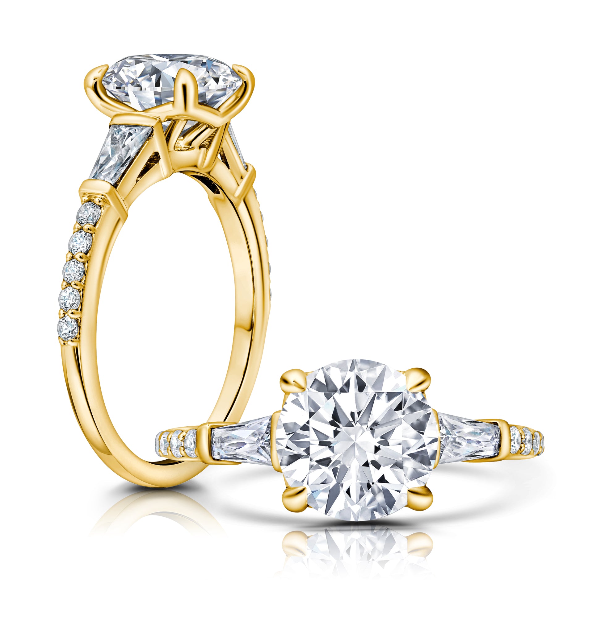 Peter adds a modern flair to this trapezoid three stone ring. Diamonds on the shank help to balance this beautiful piece.