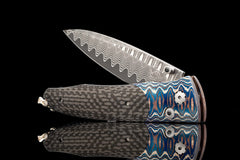 The Gentac ‘Azure Sky' features a stunning and unique frame in a heat-colored iteration of William Henry's signature 'Wave' mokume gane. This frame has been inlaid with carbon fiber scales, and the blade is crafted from 'Wave' damascus with an extra strong core in VG-10. The one-hand button lock and the thumb stud are set with spinel gemstones. An exceptional design that offers rigorous performance in a sleek, comfortable knife, the Gentac is also the perfect canvas to showcase William Henry’s range of exotic materials and techniques. The ‘Azure Sky’ features some of the exotic materials and hand-forged metals that are the hallmark of William Henry's collections; a timeless heirloom to be proudly worn and used for a lifetime before being handed-down to another generation.