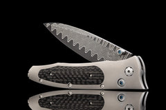 The Gentac ‘Centrifuge’ features a light and resilient frame in aerospace grade titanium, inlaid with carbon fiber. The blade is 'Wave' damascus with an extra strong core of ZDP-189. The one-hand button lock and the thumb stud are set with Kashmir blue topaz gem stones. An exceptional design that offers rigorous performance in a sleek, comfortable knife, the Gentac is also the perfect canvas to showcase William Henry’s range of exotic materials and techniques. The ‘Centrifuge’ features the craftsmanship, hi-tech, and forged metals that are the hallmark of William Henry's collections; a distinctive personality statement to be worn and used for a lifetime.