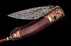 The Monarch 'Coco Wave' features a handle in 'Wave' mokume gane, inlaid with cocobolo wood. The blade is hand-forged 'Intrepid' damascus by Chad Nichols;the one-hand button lock and the thumb stud are set with black onyx gemstones. The Monarch is a simple design that is easy on the eye and effortless in the hand; the elegant shape of the handle on this design is also an ideal canvas to showcase fine hand-engraving or exotic materials. The 'Coco Wave' features the rich and unique synthesis between function, exotic materials, and the superlative artistry that is the hallmark of William Henry's collection.