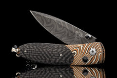 The Monarch 'Classic' features a beautiful frame in 'Twist' Mokume Gane by Mike Sakmar, inlaid with carbon fiber scales; the blade is hand-forged 'Boomerang' damascus by Chad Nichols; the one-hand button lock and the thumb stud are set with black onyx gemstones. The Monarch is a simple design that is easy on the eye and effortless in the hand; the elegant shape of the handle on this design is also an ideal canvas to showcase fine hand-engraving or exotic materials. The ‘Classic’ features some of the exotic materials, and hand-forged metals that are the hallmark of William Henry's collections; a timeless heirloom to be proudly worn and used for a lifetime before handing it down to another generation.