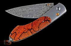 The Spearpoint ‘Forest Grove’ features a light and resilient frame in aerospace grade titanium, inlaid with a beautiful piece of orange spalted beech wood. The blade hand-forged 'Intrepid' damascus steel by Chad Nichols. The one-hand button lock and the thumb stud are set with citrine gemstones. A remarkable design that gives you an instrument with a full-size secure grip, and a versatile deep-belly blade, the Spearpoint epitomizes William Henry’s core philosophy – that superlative function deserves to be elevated to superlative art. The ‘Forest Grove’ features some of the exotic materials and hand-forged metals that are the hallmark of William Henry's collections; a distinctive personality statement to be worn and used for a lifetime.