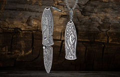 The 'Freedom' is a bold sterling silver pendant finely cast with timeless Americana symbols, featuring a hidden, state-of-the-art blade made from 'Intrepid' damascus steel, hand-forged by master forger Chad Nichols from hundreds of layers of different steel alloys and folded into unique tapestries reminiscent of waves and flowing water. A dramatic sapphire conceals William Henry’s button lock ensuring that the blade is securely locked both open and closed, for safe wear and carry. The 'Freedom' comes on a sterling silver chain. A quick release clasp, also from sterling, allows you to take the knife off the chain for use, or to attach the knife to a key chain.