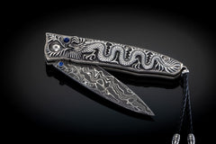 The Gentac ‘Silver Dragon’ features an intricate frame in hand-carved sterling silver by Lee Downey. The blade is hand-forged 'Intrepid' damascus by Chad Nichols. The one-hand button lock and the thumb stud are set with lapis lazuli gemstones. An exceptional design that offers rigorous performance in a sleek, comfortable knife, the Gentac is also the perfect canvas to showcase William Henry’s range of exotic materials and techniques. The ‘Silver Dragon’ features some of the unique materials, artistry, and metals that are the hallmark of William Henry's collections.