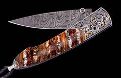 The Lancet 'Cowboy' features a beautiful hand-engraved frame with 24K gold inlays by Bottega Incisioni, and featuring stunning scales of 10,000 year-old fossil Woolly Mammoth tooth. The blade is hand-forged 'Hornets Nest' damascus steel by Mike Norris; the one-hand button lock and the thumb stud are set with spinel gemstones. Sleek, elegant, refined, and comfortable in the hand and to the eye, the Lancet defines the essential gentleman’s folder in the modern world. The ‘Cowboy’ features the superlative artistry, the exotic materials and forged metals that are the hallmark of William Henry's collections; a distinctive personality statement to be worn and used for a lifetime before handing it down to another generation.