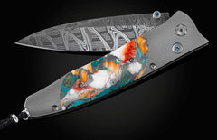 The Gentac ‘Spiny Oyster’ features a light and resilient frame in aerospace grade titanium, inlaid with spiny oyster & turquoise. The blade is stainless 'Hornets Nest' damascus steel by Mike Norris. The one-hand button lock and the thumb stud are set with blue topaz gems. An exceptional design that offers rigorous performance in a sleek, comfortable knife, the Gentac is also the perfect canvas to showcase William Henry’s range of exotic materials and techniques. The ‘Spiny Oyster’ features the craftsmanship, hi-tech, and forged metals that are the hallmark of William Henry's collections; a distinctive personality statement to be worn and used for a lifetime.