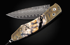The Spearpoint 'Tundra II’ features a mesmerizing frame in 24K gold Koftgari (the ancient Indian technique of inlaying gold and/or sterling silver in tool-steel), inlaid with the ring-cut of a 10,000 year-old fossil Woolly Mammoth tusk. The blade is our signature 'Wave' damascus with a VG-10 core. The one-hand button lock and the thumb stud are set with spinel gemstones. A remarkable design that gives you an instrument with a full-size secure grip, and a versatile deep-belly blade, the Spearpoint epitomizes William Henry’s core philosophy – that superlative function deserves to be elevated to superlative art. The ‘Tundra II’ features some of the most exotic materials, artistry and forged metals that are the hallmark of William Henry's collections; a timeless heirloom to be proudly worn and used for a lifetime before being handed-down to another generation.