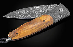 The Gentac ‘Wrangel’ features a beautiful frame in hand-forged 'Croc Skin' damascus by Chad Nichols, inlaid with bark, or outer section, of a 10,000 year-old fossil Woolly Mammoth tusk . The blade is hand-forged 'Intrepid' damascus steel also by Chad Nichols; the one-hand button lock and the thumb stud are set with spinel. An exceptional design that offers rigorous performance in a sleek, comfortable knife, the Gentac is also the perfect canvas to showcase William Henry’s range of exotic materials and techniques. The ‘Wrangel’ features some of the exotic materials and forged metals that are the hallmark of William Henry's collections; a distinctive personality statement to be worn and used for a lifetime.