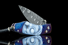 The Spearpoint 'Galaxy' features a beautiful frame of hand-forged 'Twist' damascus by Chad Nichols, who is one of the leading damascus artists in the United States. This frame is inlaid with visually stunning carved banded agate scales, and the blade is crafted from'Cosmic' damascus, hand-forged with Gibeon Meteorite and other steels, also by Chad Nichols. A remarkable design that gives you an instrument with a full-size secure grip, and a versatile deep-belly blade, the Spearpoint epitomizes William Henry’s core philosophy – that superlative function deserves to be elevated to superlative art. The ‘Galaxy’ features the artistry, hi-tech, and hand-forged metals that are the hallmark of William Henry's collections; a distinctive personality statement to be worn and used for a lifetime.
