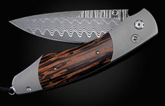 The Spearpoint ‘Palmistry' features a frame in aerospace-grade titanium, inlaid with beautiful Black Palm wood. The blade is 'Wave' damascus with an extra strong core of VG-10; the one-hand button lock and the thumb stud are set with spinel gemstones. A remarkable design that gives you an instrument with a full-size secure grip, and a versatile deep-belly blade, the Spearpoint epitomizes William Henry’s core philosophy – that superlative function deserves to be elevated to superlative art. The ‘Palmistry’ features some of the exotic materials and hand-forged metals that are the hallmark of William Henry's collections; a distinctive personality statement to be worn and used for a lifetime.