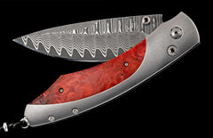 The Spearpoint ‘Poplar' features a frame in aerospace-grade titanium, inlaid with beautiful red Poplar burl. The blade is 'Wave' damascus with an extra strong core of VG-10; the one-hand button lock and the thumb stud are set with white topaz gemstones. A remarkable design that gives you an instrument with a full-size secure grip, and a versatile deep-belly blade, the Spearpoint epitomizes William Henry’s core philosophy – that superlative function deserves to be elevated to superlative art. The ‘Poplar’ features some of the exotic materials and hand-forged metals that are the hallmark of William Henry's collections; a distinctive personality statement to be worn and used for a lifetime.