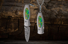 The Morpheus 'Flash' belongs equally on your neck as a pendant, in your pocket as a keychain knife, or on display as a beautiful piece of functional art. The blade is crafted using hand-forged 'Intrepid' damascus steel by Chad Nichols, and the handle is crafted from aerospace-grade titanium inlaid with Black Sea Dichrolam®. This fine knife also features a spinel gemstone and 22 inch black PVD coated bronze chain. A fine, functional, and timeless William Henry creation.(Optional 18, 20, or 24 inch chain by request)