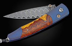 The Lancet 'Desert Blues' features a light and resilient frame in aerospace grade titanium, inlaid with desert ironwood. The blade is 'Wave' damascus with an extra strong core in VG-10; the one-hand button lock and the thumb stud are set with citrines. Sleek, elegant, refined, and comfortable in the hand and to the eye, the Lancet defines the essential gentleman’s folder in the modern world. The 'Desert Blues' features some of the exotic materials and hand-forged metals that are the hallmark of William Henry's collections; a distinctive personality statement to be worn and used for a lifetime.