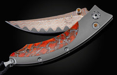 The Persian 'Copper Sunset II' features a titanium frame inlaid with zinc matrix Apple Coral scales. The blade is 'Copper Wave' damascus with a core of VG-5. The one-hand button lock and the thumb stud have been set with citrine gemstones. The Persian is an elegant synthesis of dramatic lines, graceful curves, and exquisite materials. A bold interpretation of a timeless design, the 'Copper Sunset II' also features some of the rare exotic materials, and hand-forged metals that are the hallmark of William Henry's collections; a timeless heirloom to be proudly worn and used for a lifetime.