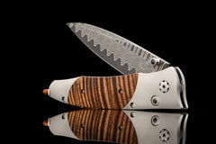 The Gentac ‘Koa' features a light and resilient frame in brushed finish titanium, inlaid with curly koa wood. The blade is 'Wave' damascus with a core of VG-10steel; the one-hand button lock and the thumb stud are set with spinel gemstones. An exceptional design that offers rigorous performance in a sleek, comfortable knife, the Gentac is also the perfect canvas to showcase William Henry’s range of exotic materials and techniques. The 'Koa’ features some of the hi-tech materials and hand-forged metals that are the hallmark of William Henry's collections; a modern design for a timeless heirloom to be proudly worn and used for a lifetime before being handed-down to another generation.