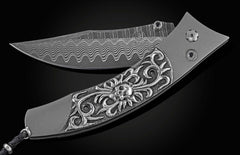 The Contour ‘Skull Candy' features a frame in aerospace grade titanium, inlaid with hand-carved sterling silver by Lee Downey. The blade is our 'Wave' damascus steel with a core of VG-10. The one-hand button lock and the thumb stud are set with spinel gemstones. The Contour is an exquisite fusion of elegant lines, graceful curves, and exquisite materials. A bold interpretation of a timeless design, the 'Skull Candy' also features some of the most exotic materials and hand-forged metals that are the hallmark of William Henry's collections; a timeless heirloom to be proudly worn and used for a lifetime before being handed-down to another generation.
