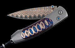 The Monarch 'Heat Wave' features a light and resilient frame which is machined from aerospace grade titanium, then finished with a fine blast-polishing. The unique inlay is crafted from heat-colored 'Wave Mokume'. The blade is crafted from the striking 'Copper Wave' damascus steel; with an extra strong core in VG-5. The one-hand button lock and the thumb stud are set with Kashmir blue topaz gemstones. The Monarch is a simple design that is easy on the eye and effortless in the hand; the elegant shape of the handle on this design is also an ideal canvas to showcase fine hand-engraving or exotic materials. The 'Heat Wave' features the rich and unique synthesis between function, exotic materials, and the superlative artistry that is the hallmark of William Henry's collection.