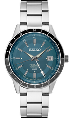 Presage Style60's GMT. Offering the finest in Japanese mechanical watchmaking, the Presage Collection blends precision technology with superior craftsmanship and design. Inspired by the steering wheel, levers, instruments and metallic colors of vintage 1960s touring cars, the Style60's GMTGMT models create a distinctive retro feel with broad angular lines, box-shaped crystals, faceted indices and sharp hand design. Celebrating the spirit of the decade, the collection incorporates dial elements from Seiko’s 1964 “Crown Chronograph,” Japan’s first watch with a stopwatch function. Framed by a black and dark gray 24-hour GMT bezel, the warm blue-gray dial features a date calendar and GMT hand, as well as LumiBrite hands and markers. The screwdown see-through caseback provides a view of the 24-jewel movement with manual winding capability, a frequency of 21,600 vibrations per hour and a power reserve of approximately 41 hours. Crafted of stainless steel, in a new hairline finish suggesting the metallic, machine-like feel of ’60s cars, this memorable timepiece includes a tri-fold push button release clasp. 10 bar, 100M Water Resistant
