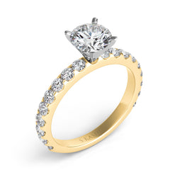 This Engagement Ring is available in 14K Yellow Gold. There are a total of 18 stones. There are Rounds with a total carat weight of 0.77 set in a Prong Set setting.