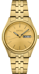 From the Essentials Collection. Offering classic dress/sport designs, the Essentials Collection provides the ideal solution for everyday wear. Crafted of stainless steel in gold-tone finish, this perfectly balanced watch features a champagne sunray dial with day/date calendar and sleek gold stick markers for a superb blend of clarity and style. 10 bar, 100M Water Resistant