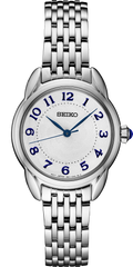 From the Essentials Collection. With elegant, jewelry-inspired styling, this gracefully updated watch features a sophisticated white dial with subtle center radial pattern, blue hands, and blue Arabic numerals for easy reading of the time at a glance. Including a classic cabochon crown, this beautifully balanced design is crafted of stainless steel and offers a tri-fold push button release clasp. 5 bar, 50M Water Resistant