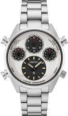 Prospex Seiko Watchmaking 110th Anniversary Limited Edition. To mark 110 years of watchmaking excellence, Seiko is highlighting its continuous dedication to evolving technology, as well as diversity, equality and the sustainable manufacturing necessary to meet environmental challenges. Available only in a controlled-production run of 3,500, this exceptional Limited Edition celebrates both the 110th anniversary of Seiko watchmaking and the 40th anniversary of Seiko's - and the world’s - first analog quartz chronograph, which offered a 1/100-second stopwatch. Featuring the new solar chronograph 8A50 movement, powered by any light source, with no battery change required and a 6-month power reserve when fully charged, this remarkable timepiece provides chronograph measurement of up to 60 minutes of elapsed time in 1/100-second increments with a split time function. The concave tops of the hammer-shaped pushers allow easy utilization of the stopwatch feature. For enhanced legibility, the uniquely designed dial includes a white base with four inset black subdials, separating the time dial from the chronograph indicators, LumiBrite hands and markers, and, in tribute to the 1913 Laurel, Seiko’s first wristwatch, red hands on the top three subdials. With a curved anti-reflective sapphire crystal, this durable stainless steel timepiece includes a screwdown caseback and tri-fold push button release clasp, and comes with an additional dark brown sustainable leather strap certified by the Leather Working Group (LWG). Packaged in a Limited Edition collectors’ box. 10 bar, 100M Water Resistant