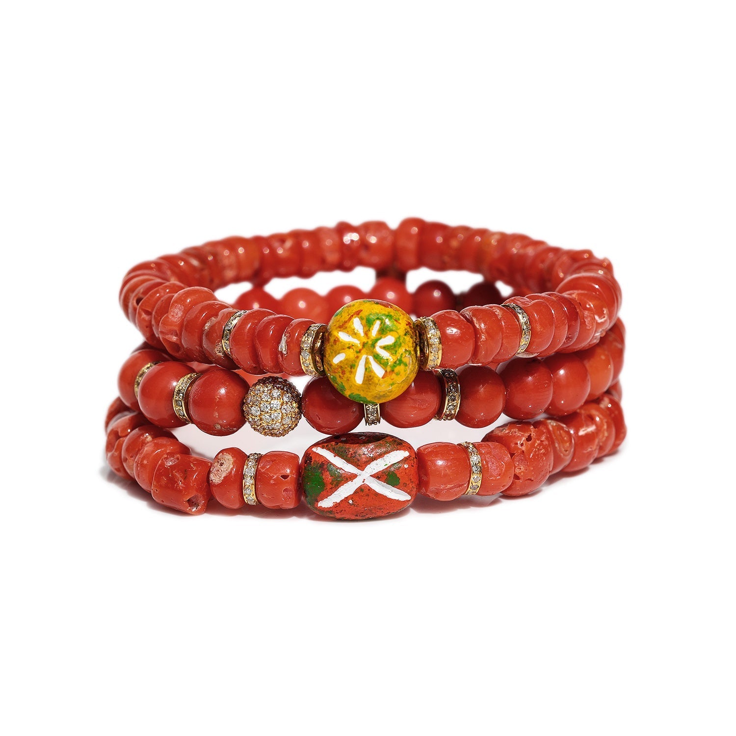 14k Antique Red Coral Beaded Bracelet with African Bead & Diamond Rondelles - One of a Kind