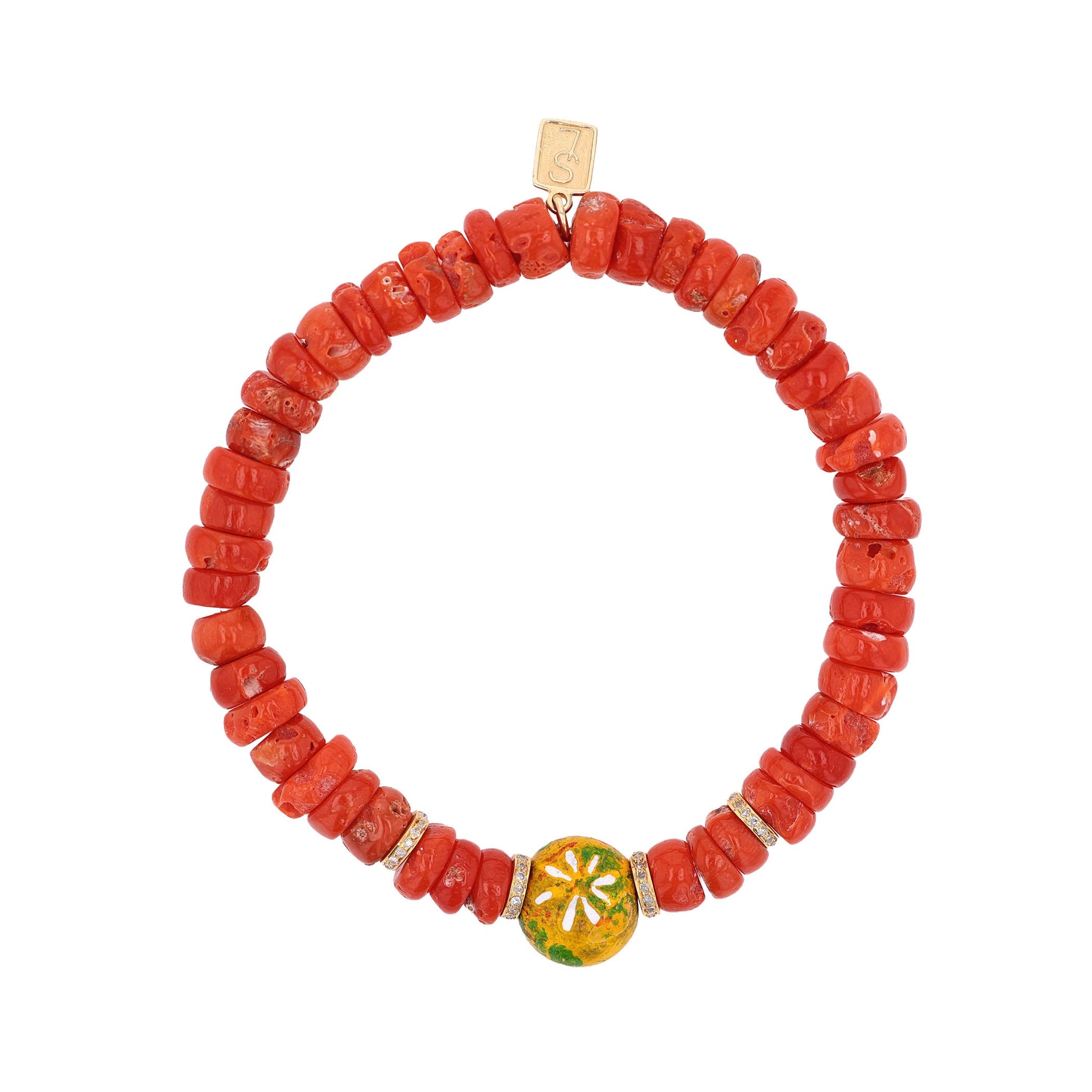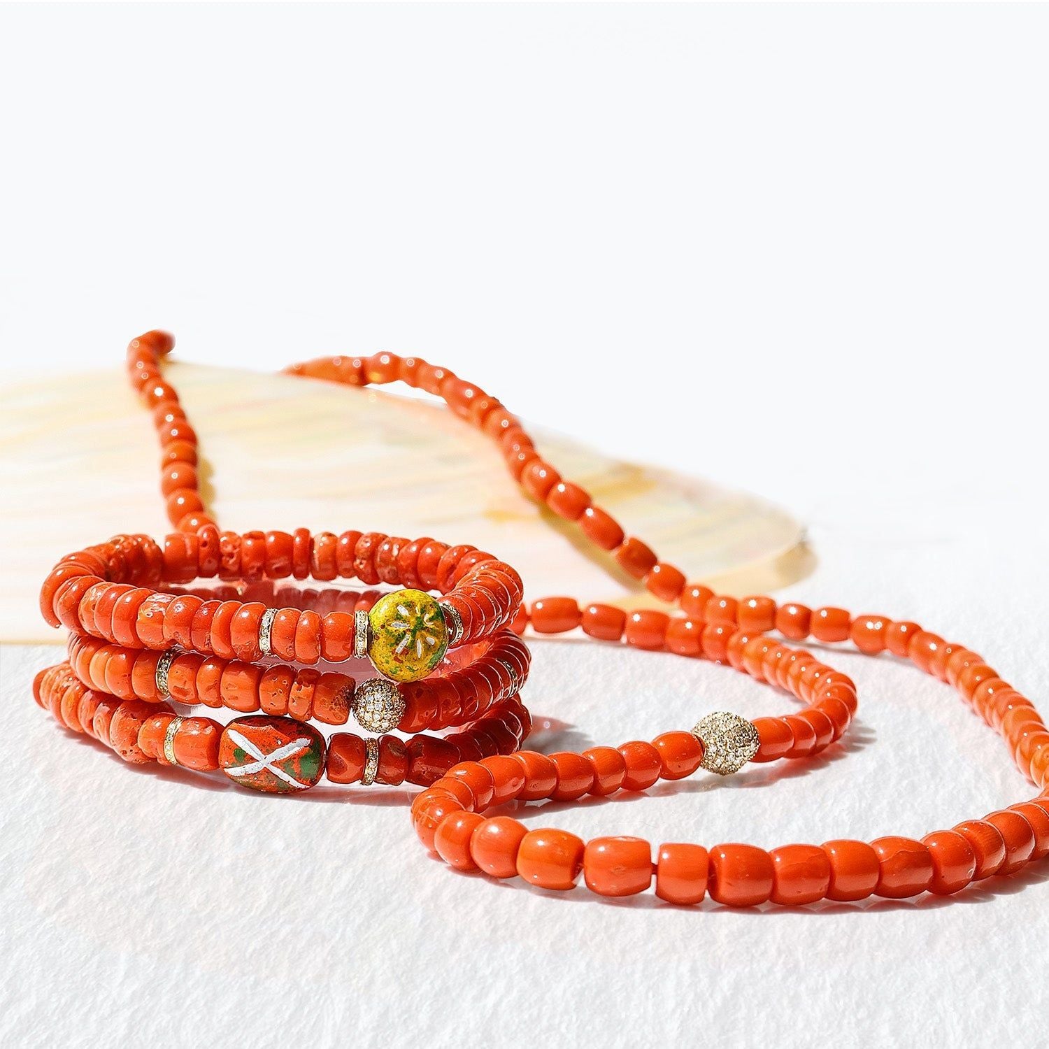 14k Antique Red Coral Bracelet with African Bead & 4 Diamond Rondelles - One of a Kind