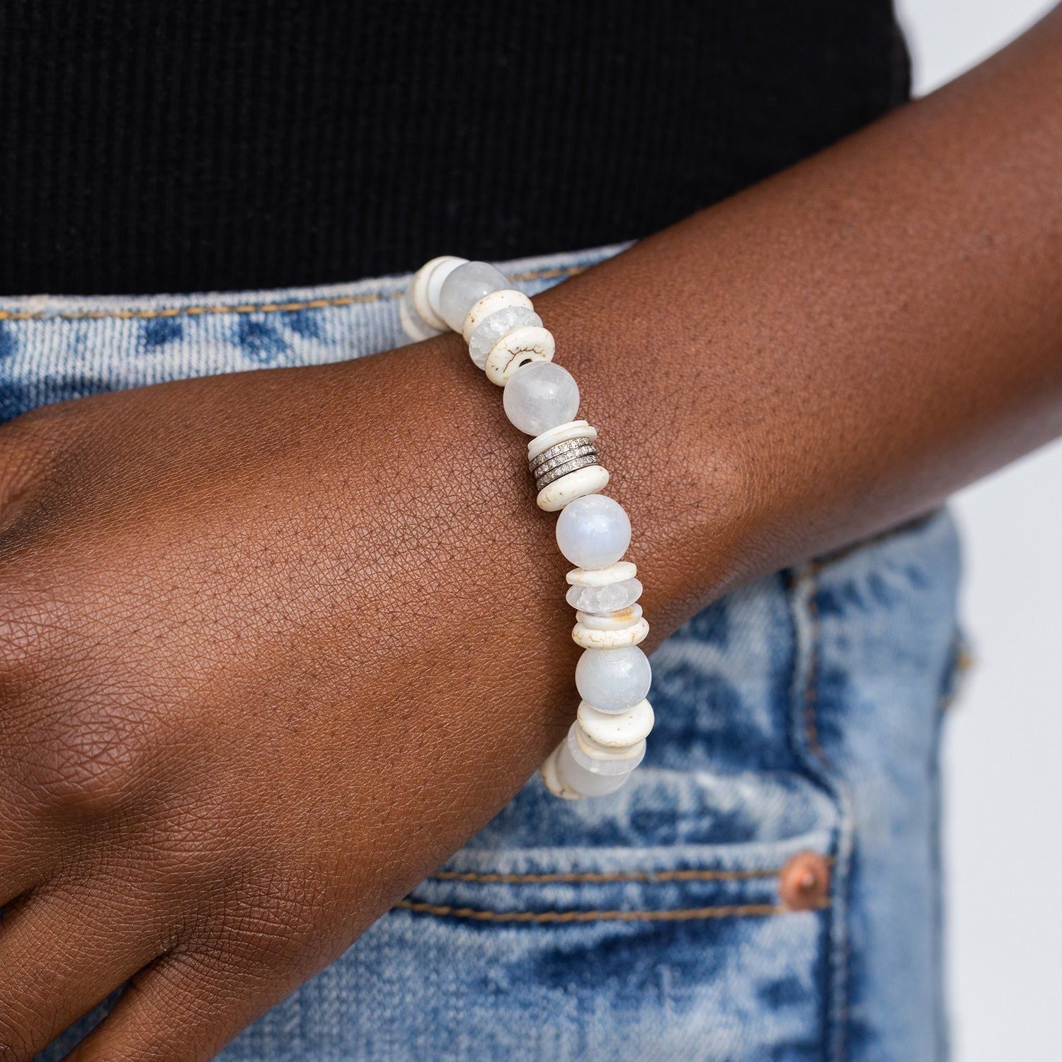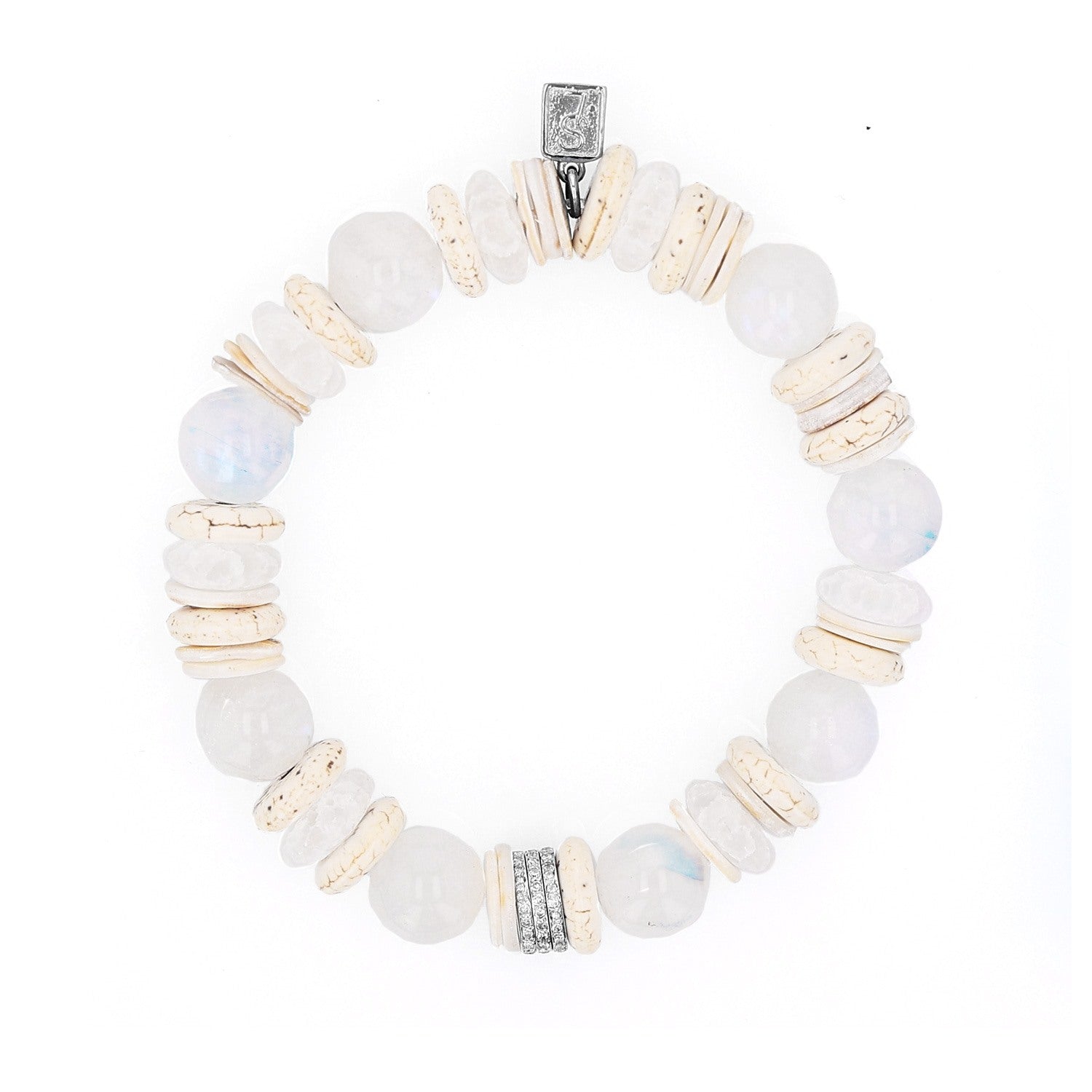 White Mix Bead Bracelet with 3 Diamond Rondelles - 10mm