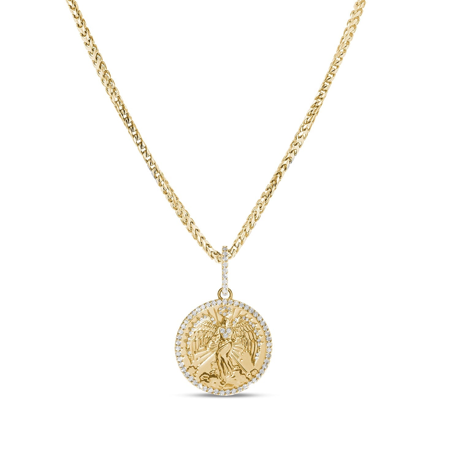 Our Guardian Angel coin, adorned with both a diamond halo and a diamond heart, represents the power of love to both protect and guide us. The magnificent angel is a handmade design with wings that are accented in gleaming diamonds. Additional diamond accents dazzle the eye with enlightened brilliance.