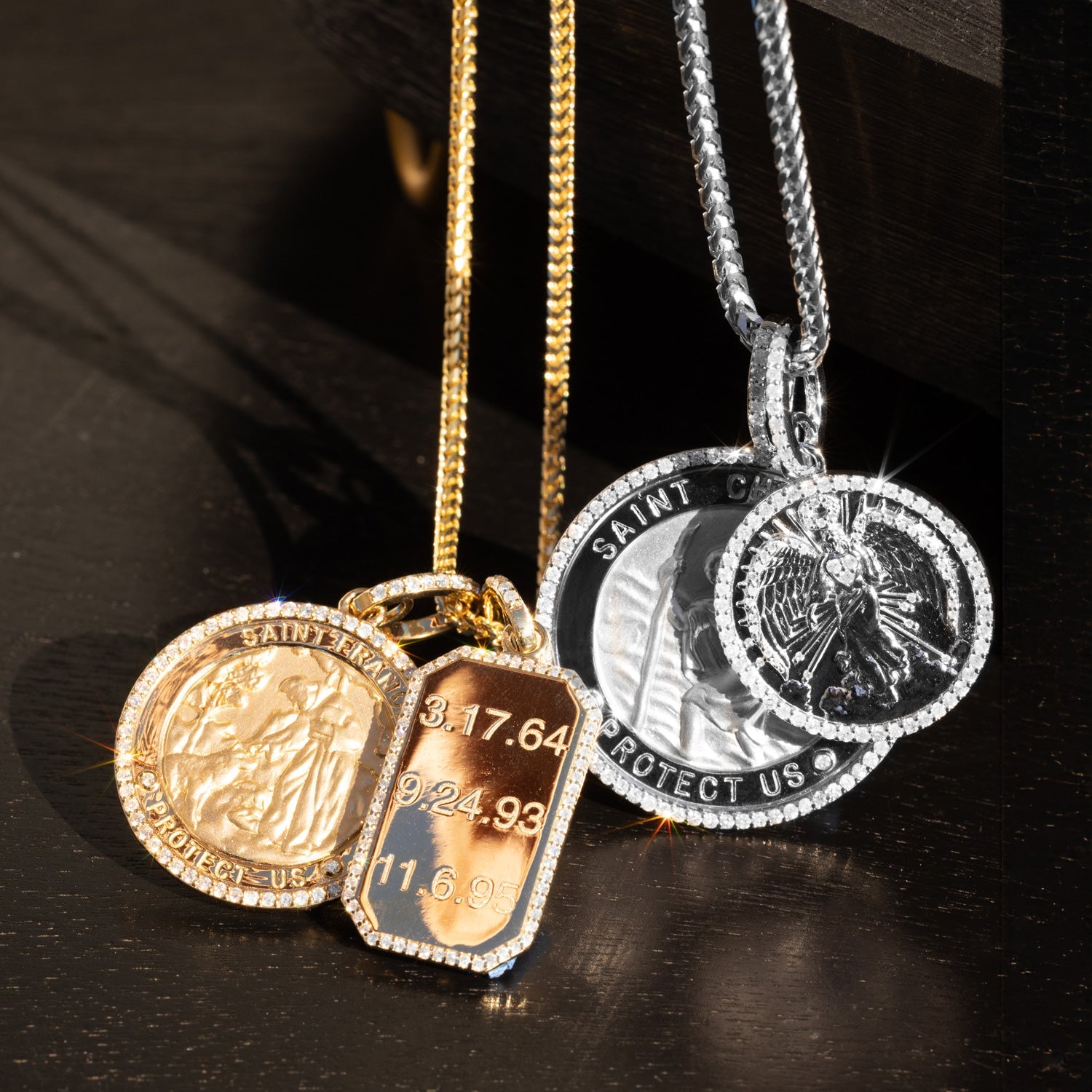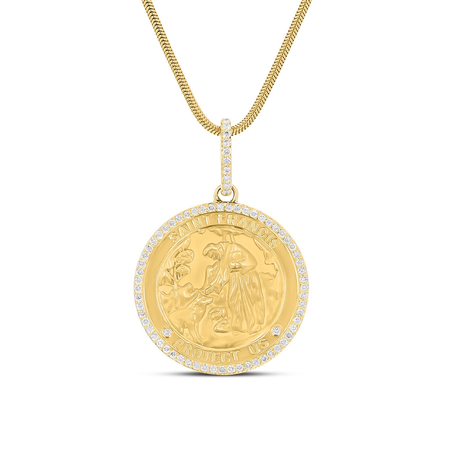14k St. Francis "Protect Us" Diamond Halo 30mm Medallion Only or on 30" Snake Chain