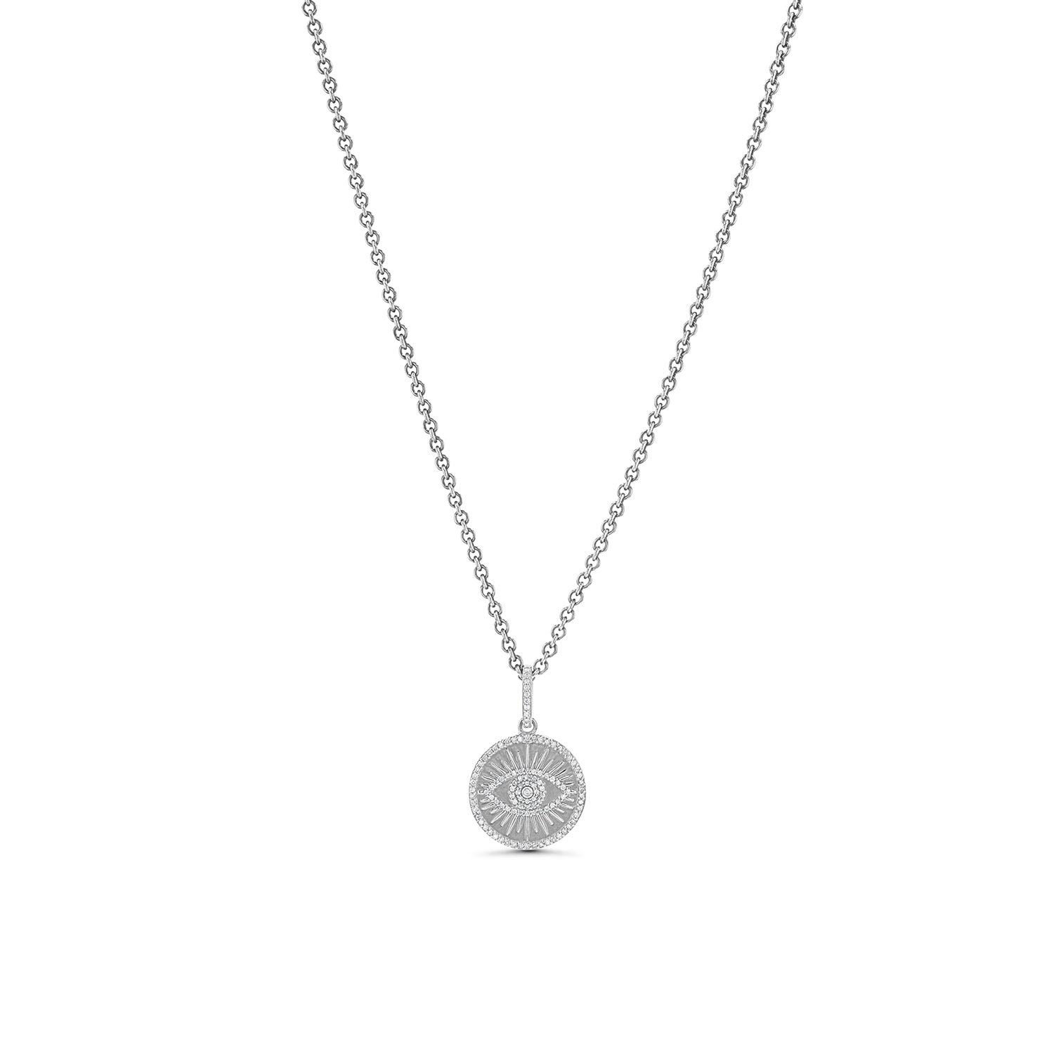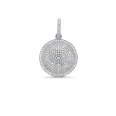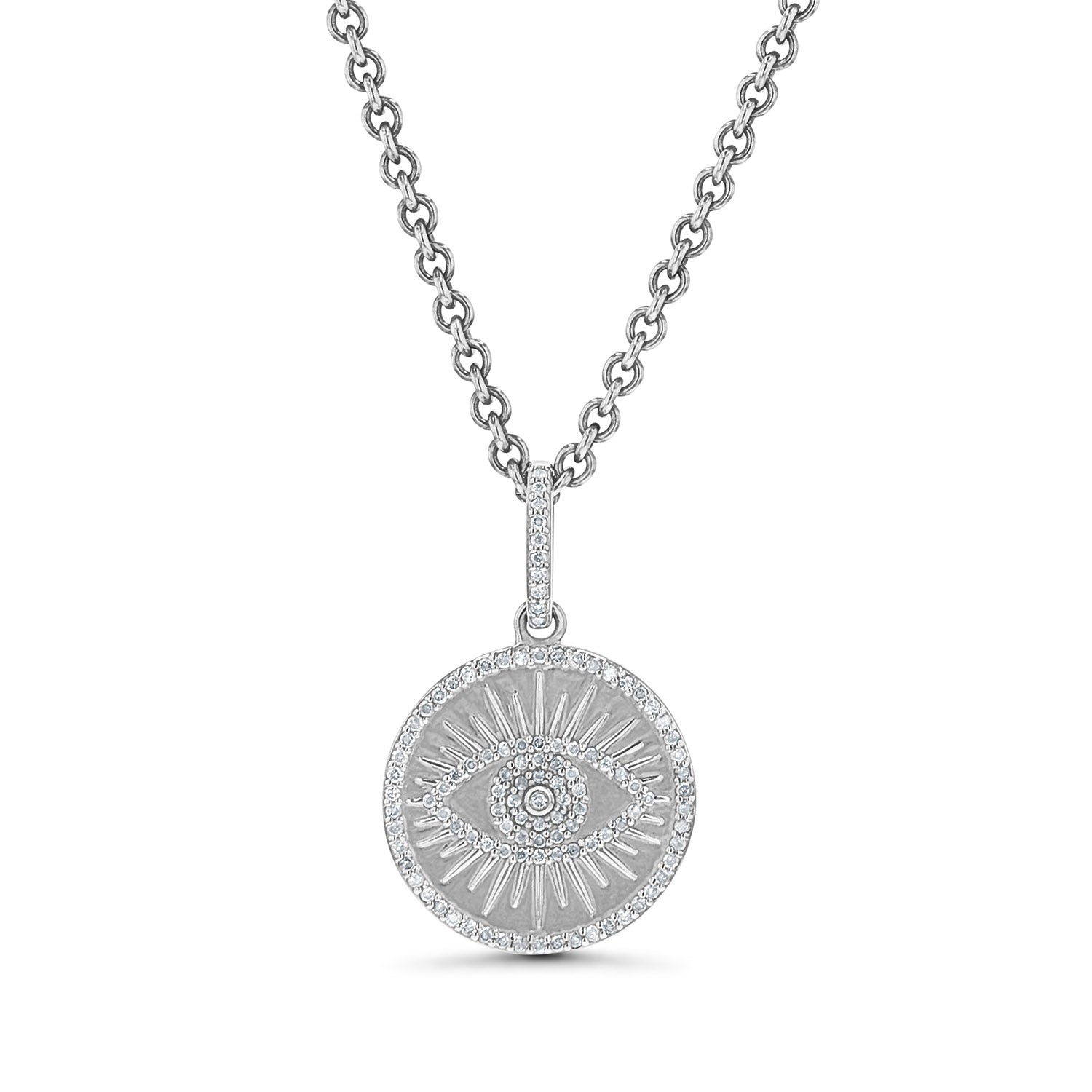 The Silver and Diamond Round Evil Eye Pendant dazzles with its diamond cobblestone Evil Eye symbol and center bezel diamond. A sparkling pave diamond border and bale add a touch more elegance. This Evil Eye Pendant Medallion will elevate any outfit and serve as a powerful talisman and protective symbol. Also sold as a complete necklace.