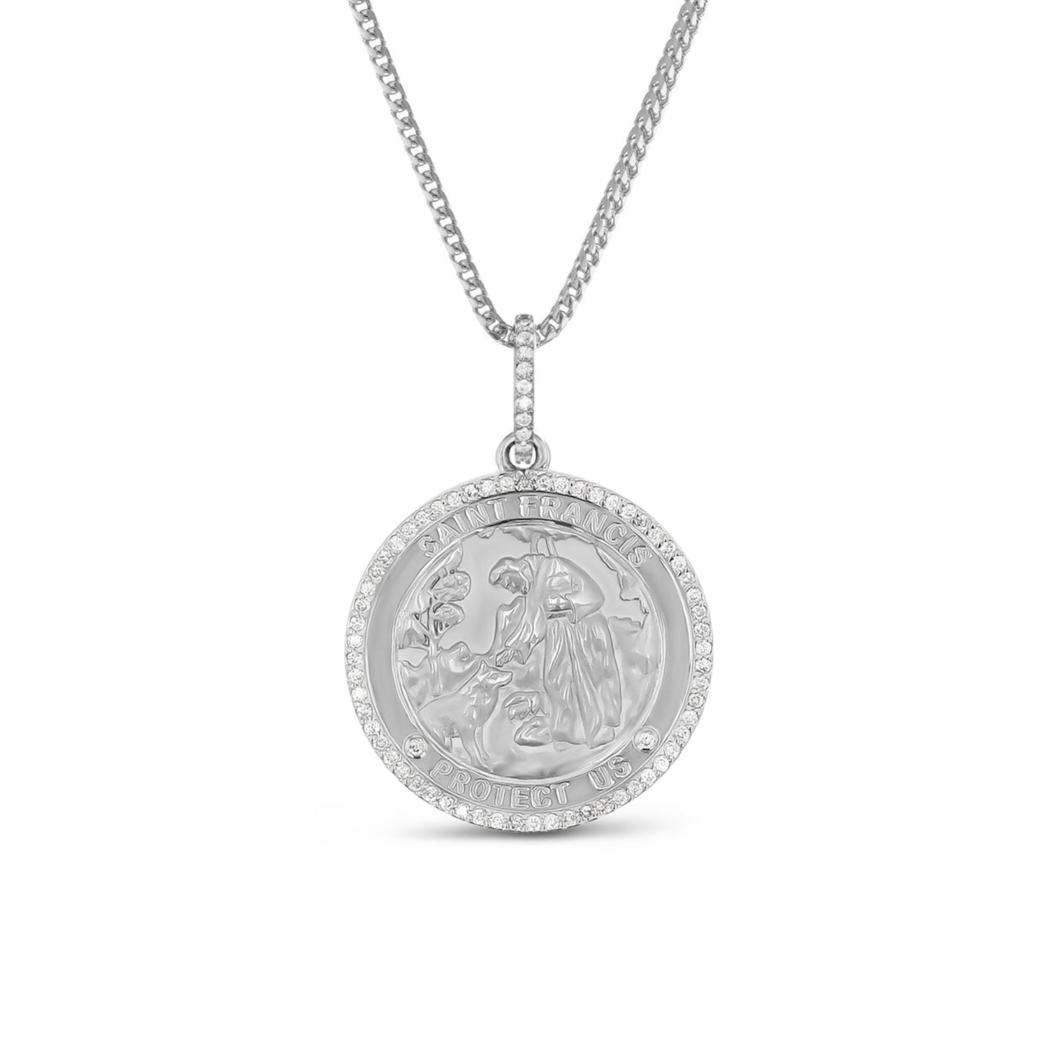 St. Francis "Protect Us" Diamond Halo 30mm Medallion Only or on 18" Franco Chain