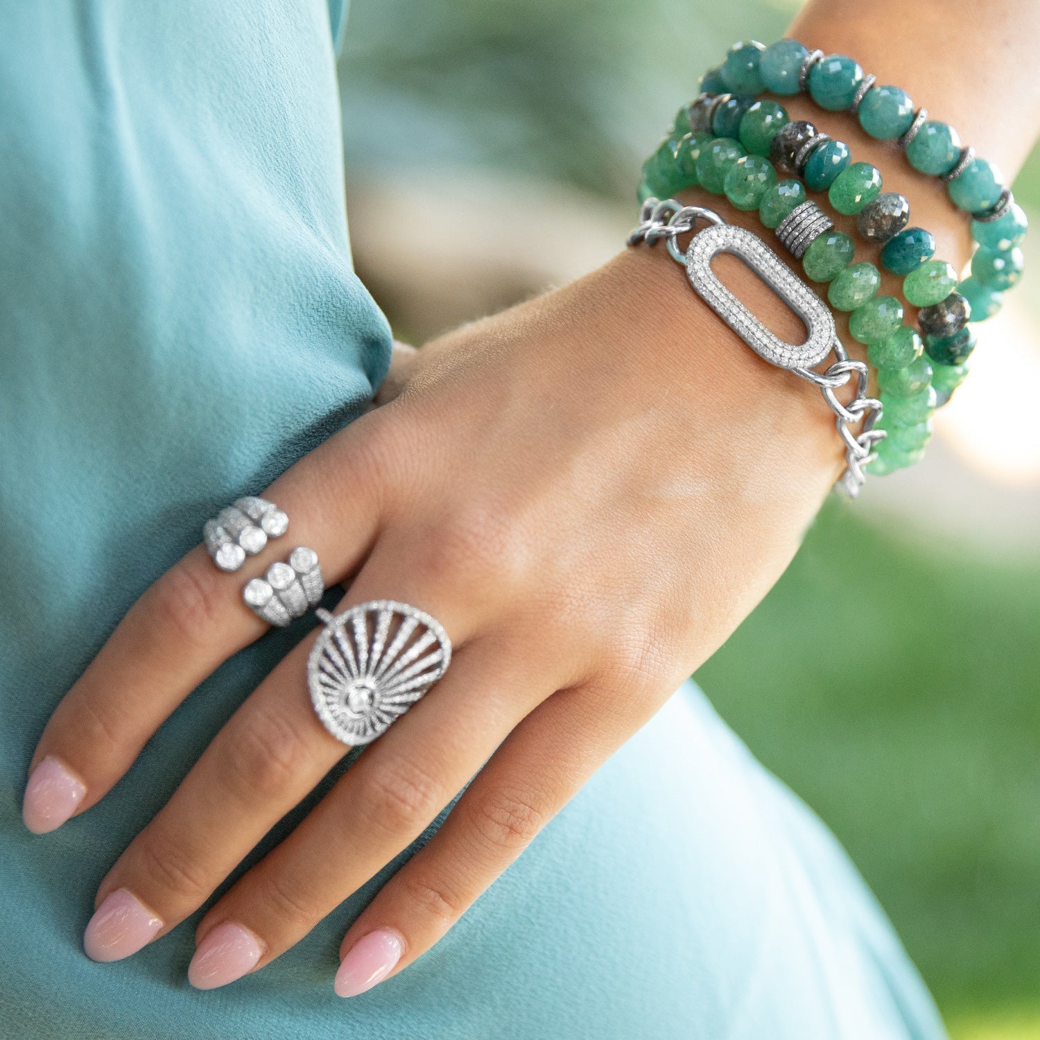Six round diamonds are set in silver bezels and stacked at the top of three diamond coils that wrap the finger in sparkle.