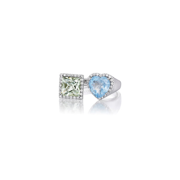 Heart Two Stone Ring - Green Amethyst & Aquamarine