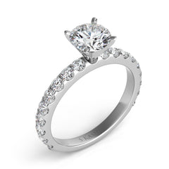 This Engagement Ring is available in 14K White Gold. There are a total of 18 stones. There are Rounds with a total carat weight of 0.77 set in a Prong Set setting.