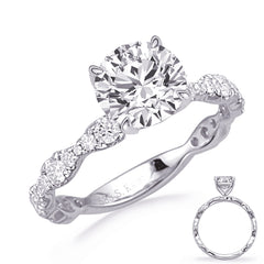 This Engagement Ring is available in 14K White Gold. There are a total of 32 stones. There are Rounds with a total carat weight of 0.58 set in a Prong Set setting.