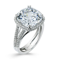 This stunning ring features sparkling diamonds along the halo and split-shank design.