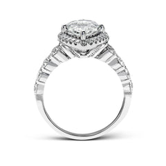 The delicate design of this classic engagement ring features a sparkling pav-set halo accented by shimmering round white diamonds.