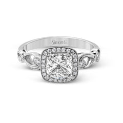 This classic halo engagement ring features a distinctive design adorned with sparkling white diamonds.