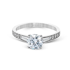 This dazzling engagement ring features an intricate design set with a combination of shimmering baguette and round diamonds.