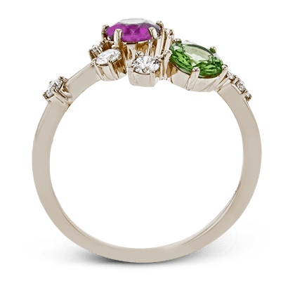 The distinctive, organic design of this 18k rose gold ring is set with a lavender pink spinel stone and a green tsavorite garnet.