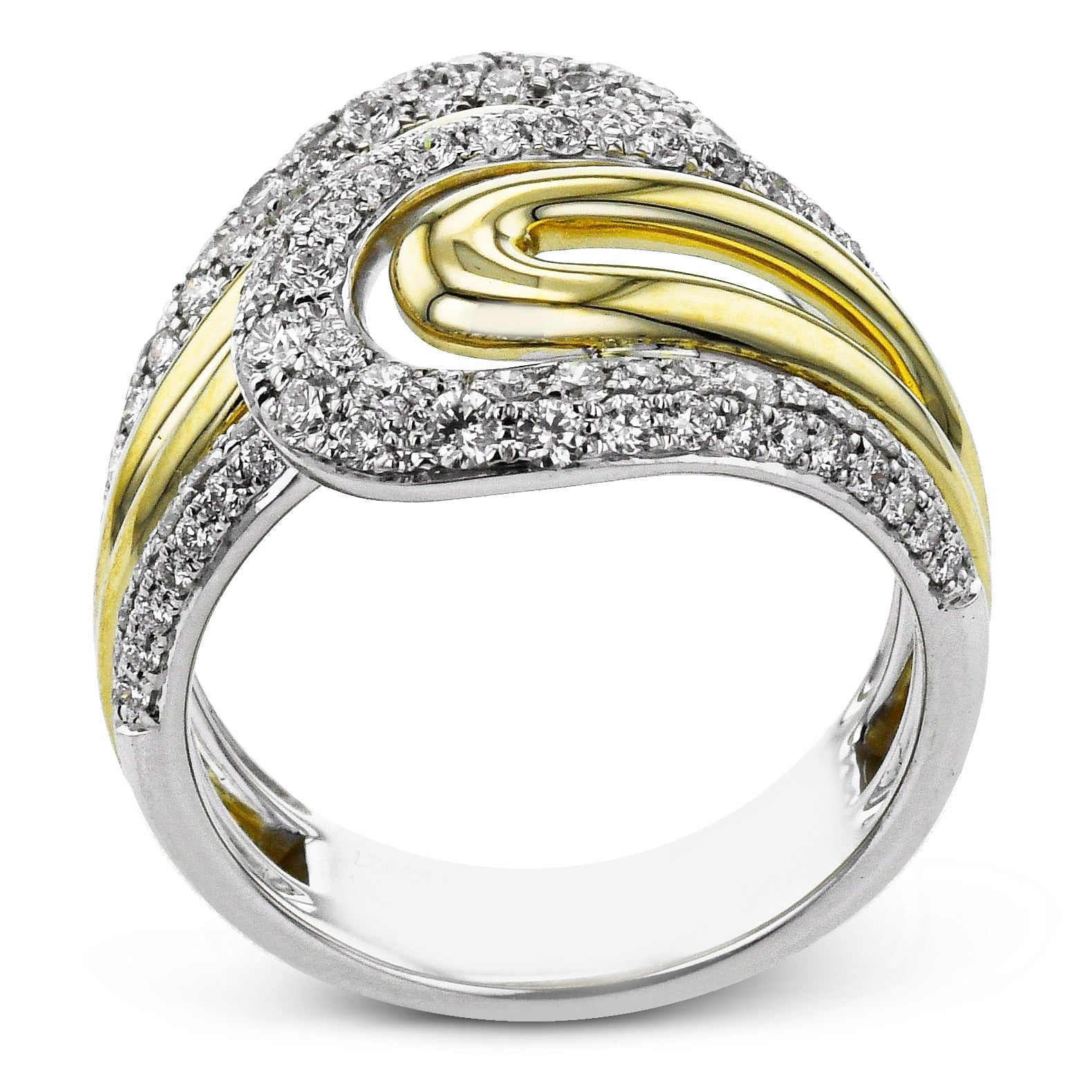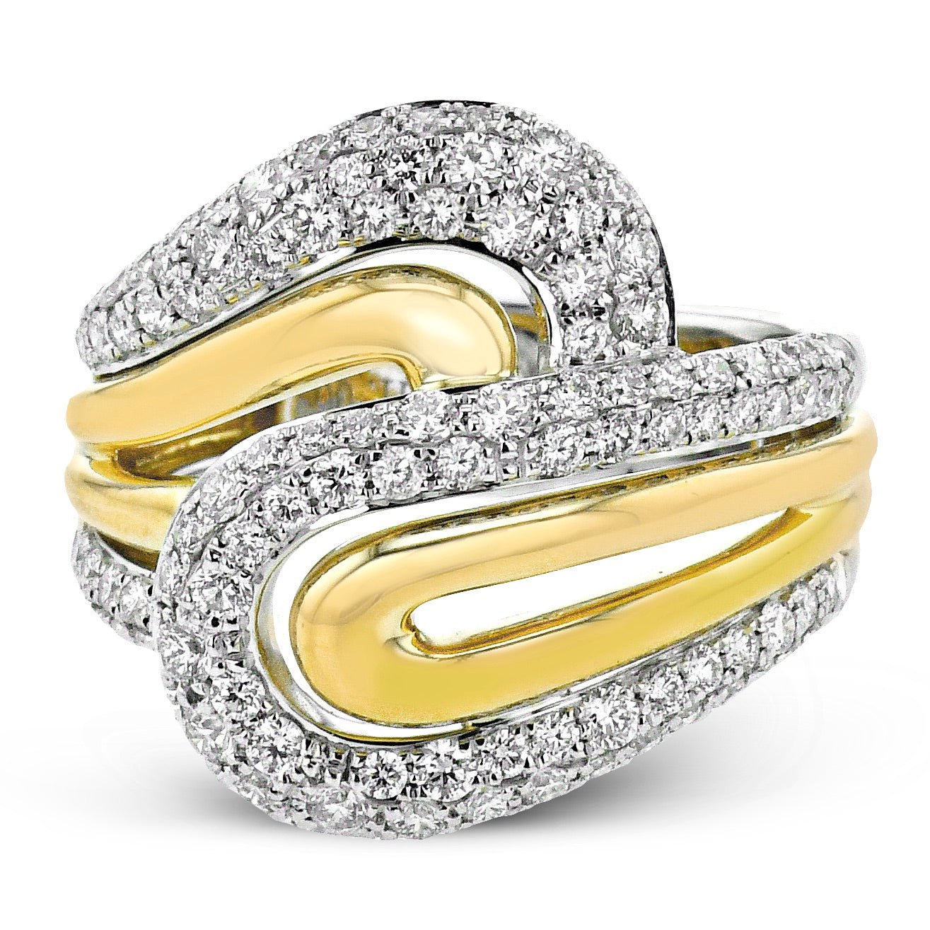 This bold ring features an intricate, two-tone design set with sparkling diamonds.