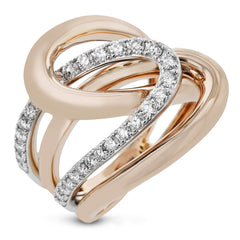 This distinctive, two-tone ring features a unique twist design and sparkling white diamonds.