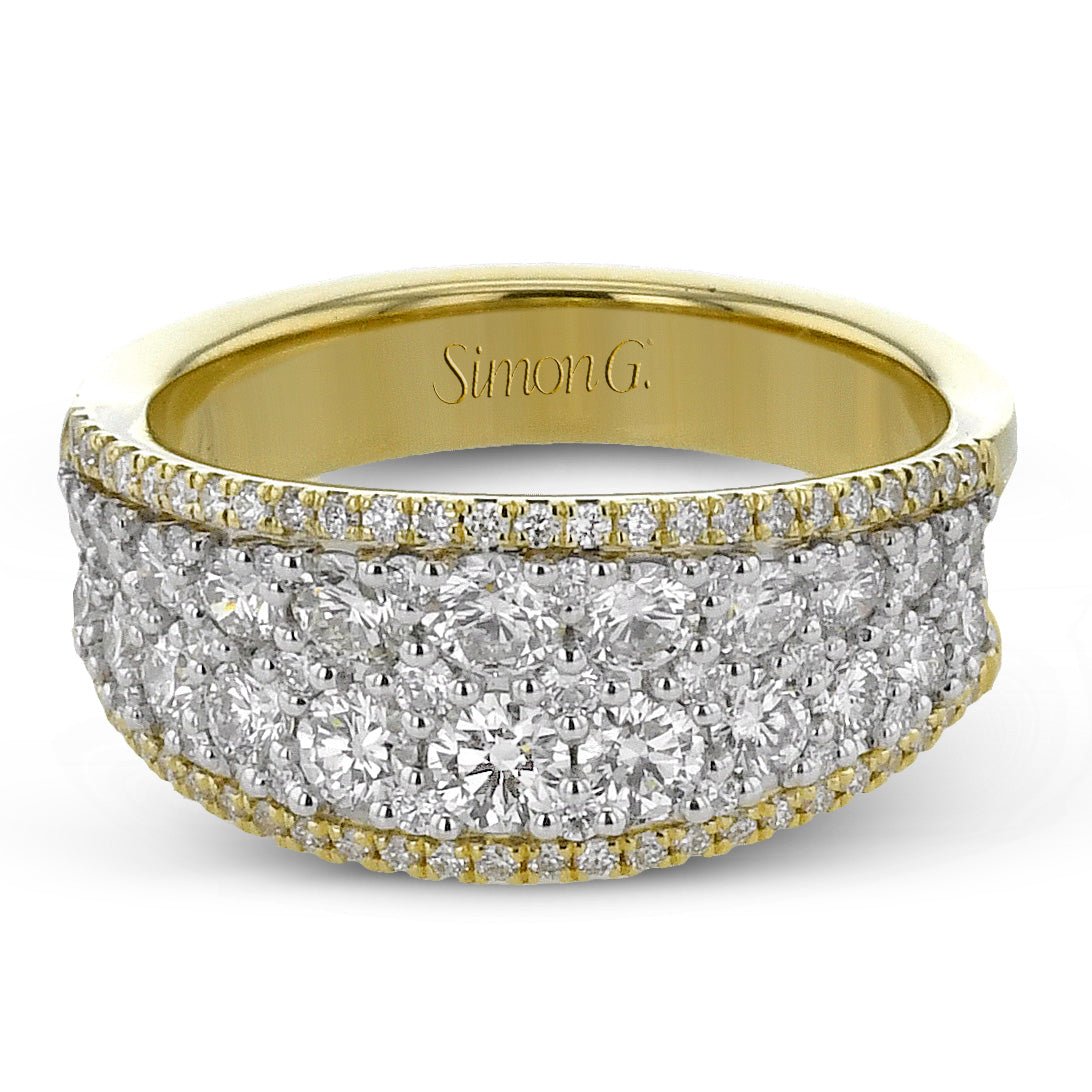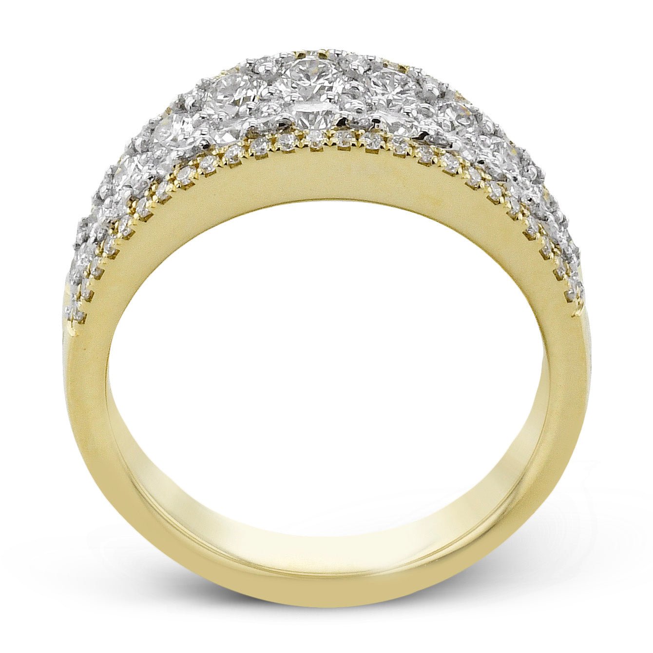 This statement ring boasts brilliant diamonds set in its white gold center and yellow gold shank.