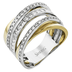 This bold ring features an intricate split-shank design adorned with a dazzling combination of pear and round diamonds.