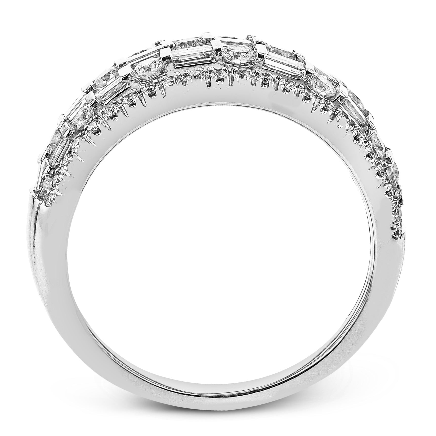 This fashion ring exudes elegance with its layered design and stunning mix of round and baguette diamonds.